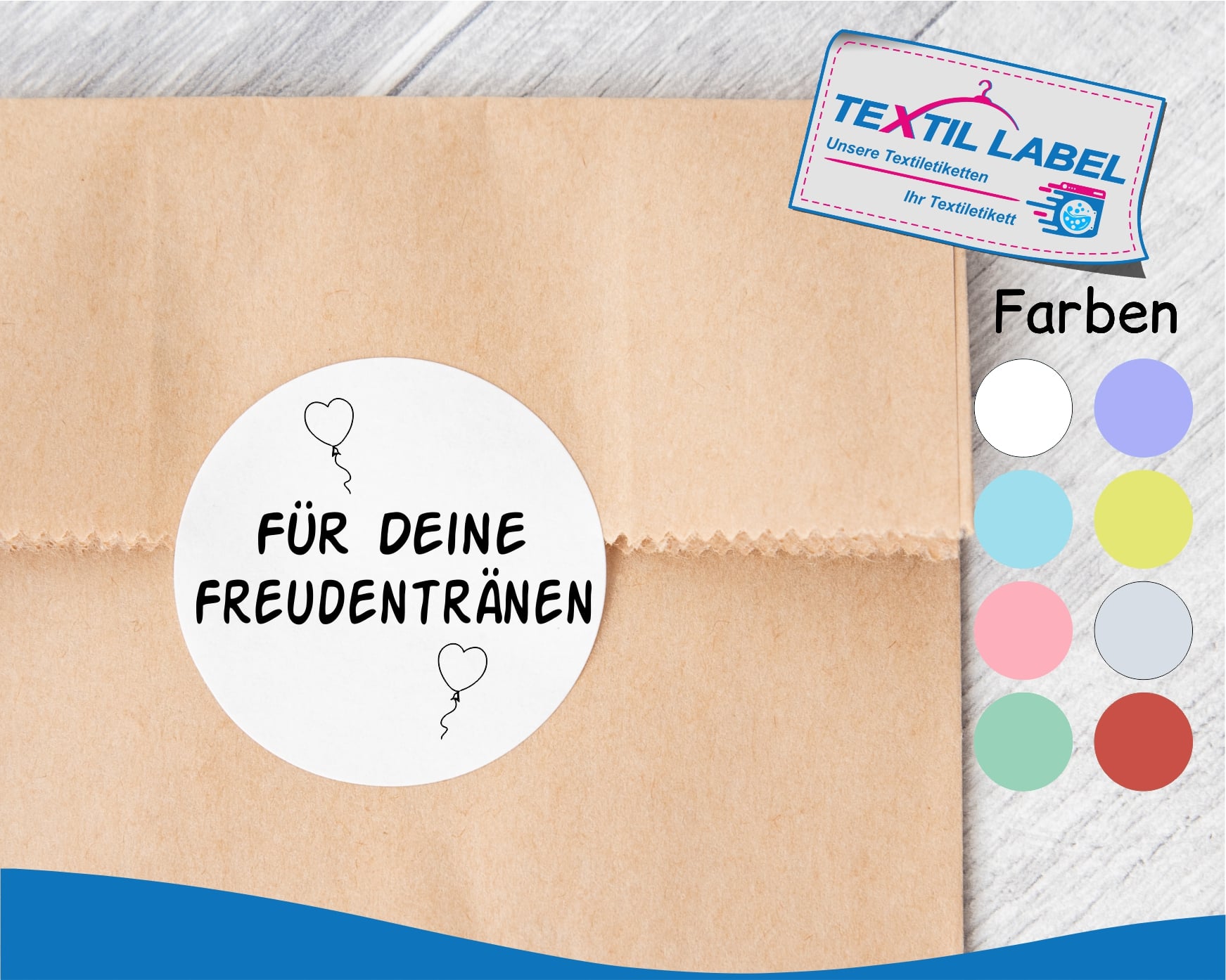 Freudentränen Aufkleber , rund Ø 5cm, „Für deine Freudentränen“mit Ballons Herze